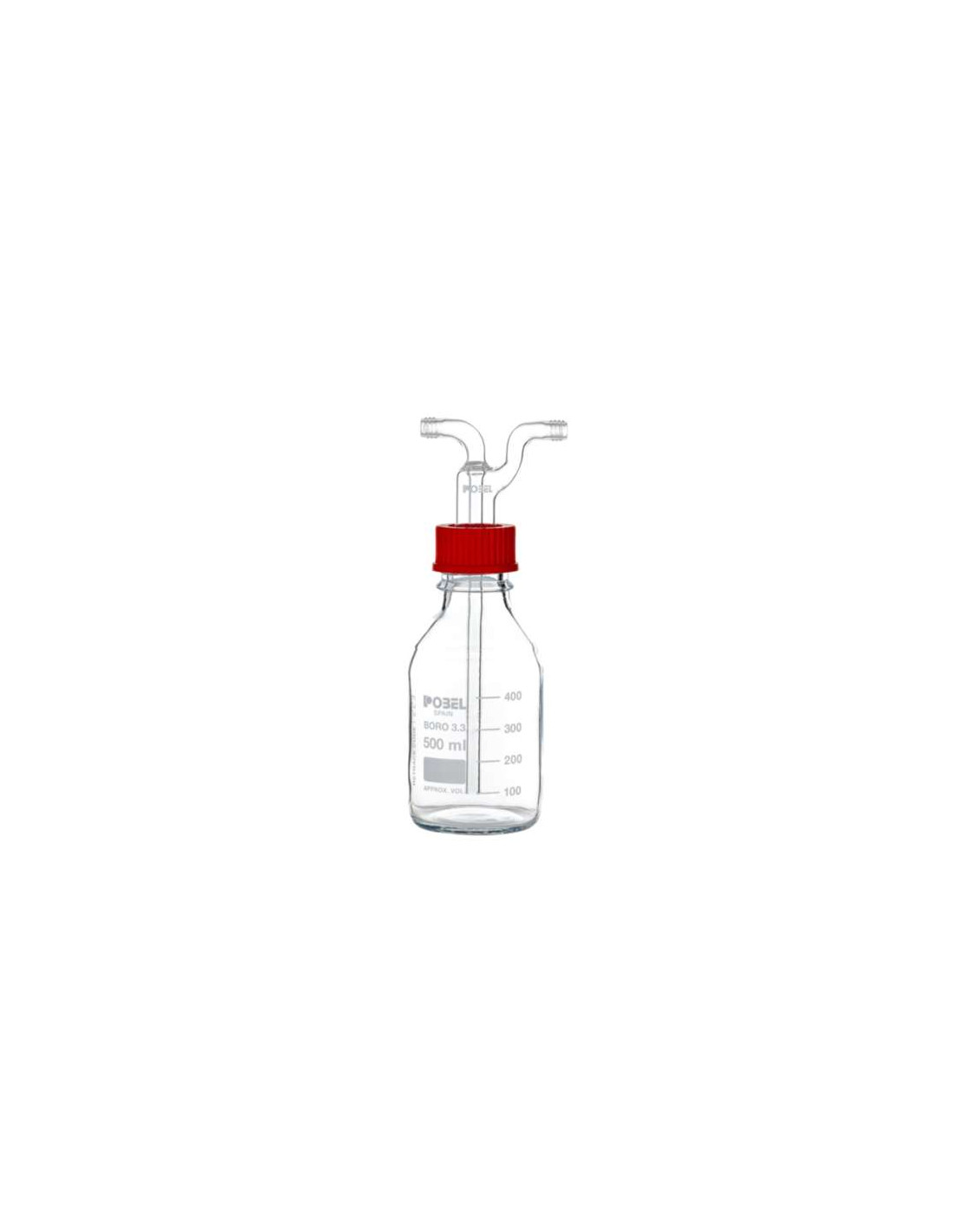 Drechsel gas washing bottle with threaded top and GL-14 connectors, made of borosilicate glass 3.3. The equipment is supplied complete, including the GL-45 bottle, the head with GL-14 connectors and the GL-45 screw cap with hole. Available in different capacities.