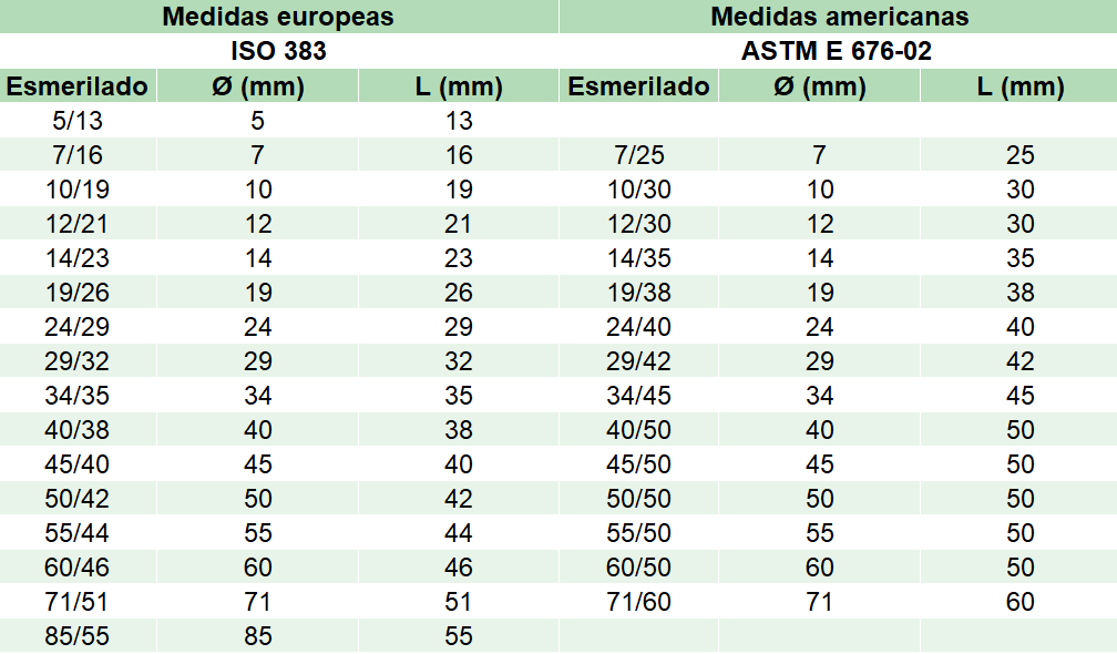 Existen dos sistemas principales de medidas: el europeo (DIN/ISO) y el americano (NS/TS). Ambos utilizan números similares, pero la conicidad y algunos diámetros pueden variar según proveedor. Aun así, en la mayoría de aplicaciones la compatibilidad se mantiene siempre que se conserve el mismo número superior.